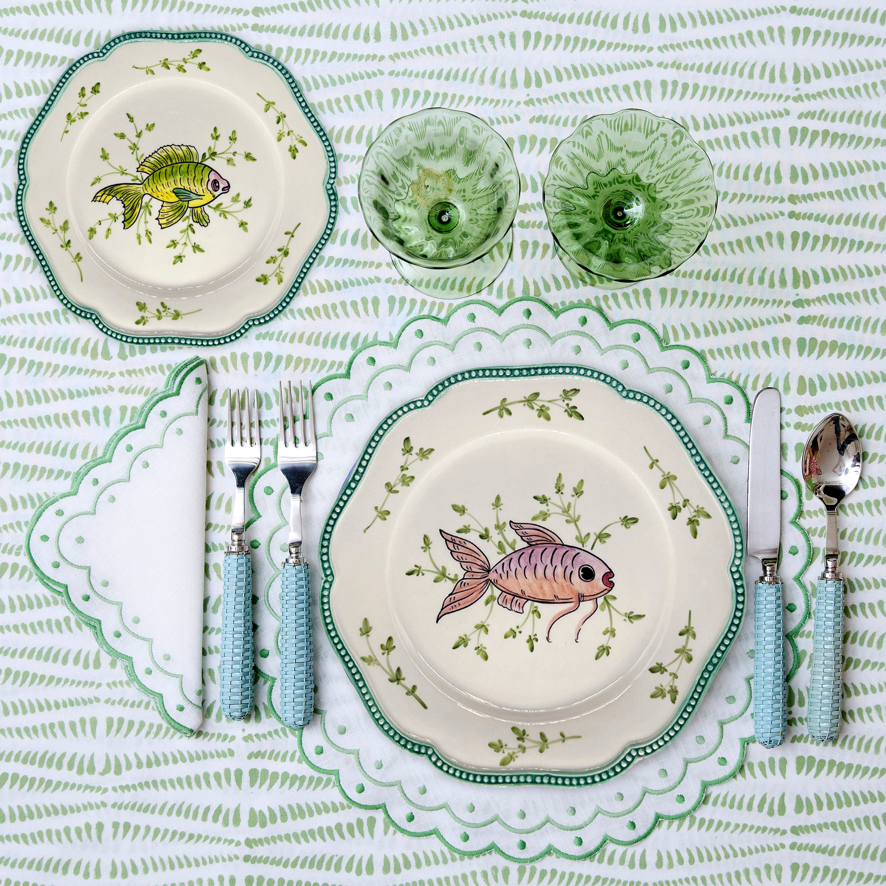 Hand painted in ceramic plates with elegant fish motif and sublte relief.A coastal classic with artisanal charm and timeless appeal.