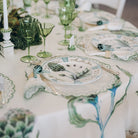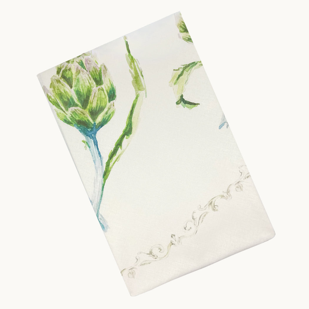 Elegant and unexpected, this hand-painted tablecloth features delicate artichokes in soft greens and blues, paired with a subtle decorative border. Perfect for countryside lunches, spring gatherings, or adding a refined botanical touch to your table setting.