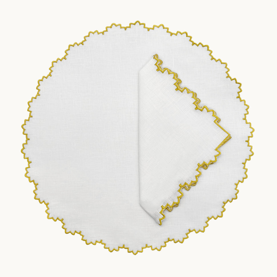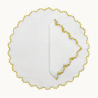 Our elegant 100% napkins placemat featuring intricate embroidery and a gold delicate scalloped edge. A refined touch for any sophisticated table setting.
