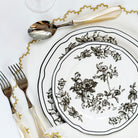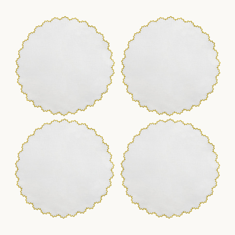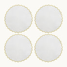 Our gardenia elegant 100% linen placemat featuring intricate embroidery and a golden delicate scalloped edge. A refined touch for any sophisticated table setting.