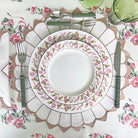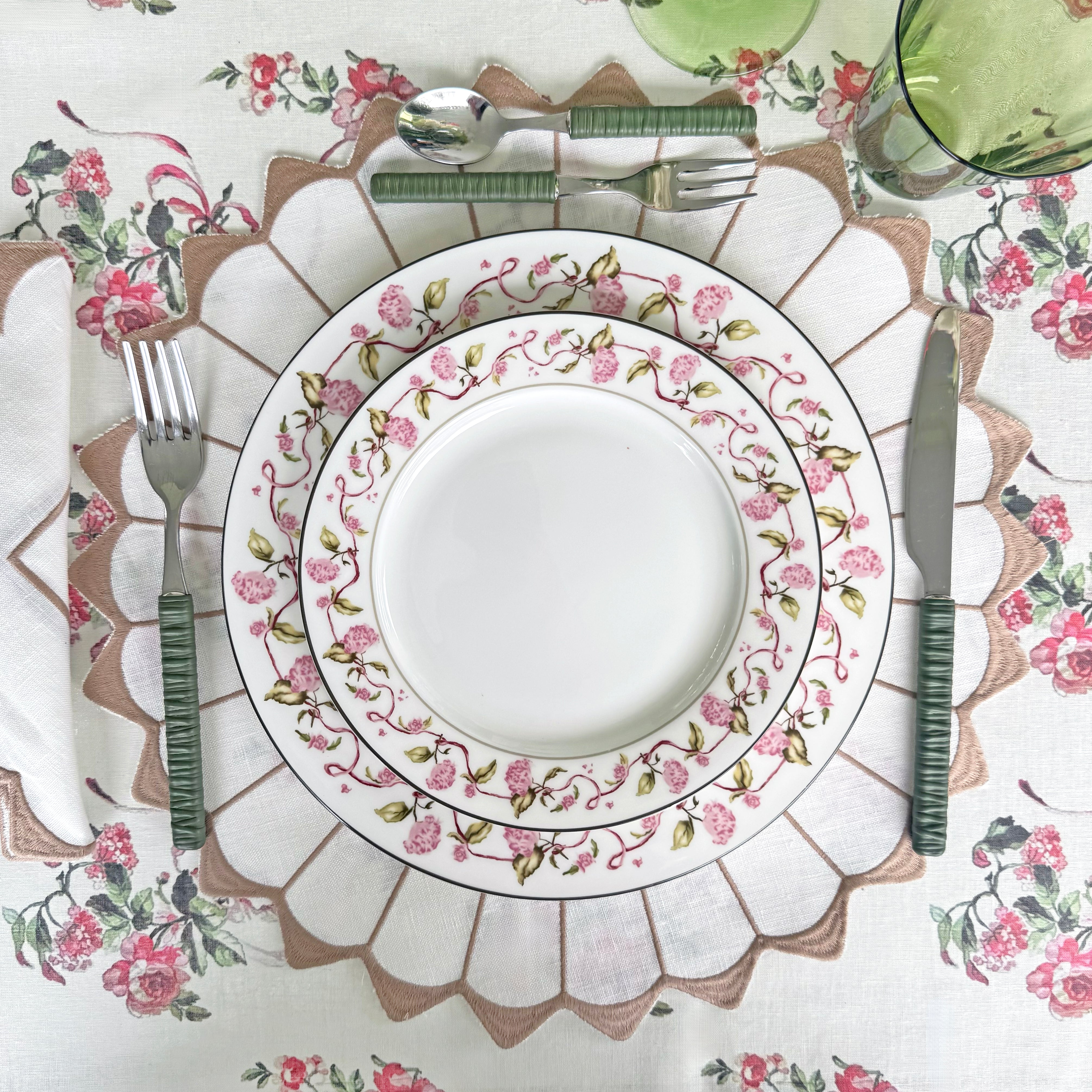 Romantic and timeless, this tablecloth features hand-painted roses entwined with soft pink ribbons, evoking classic garden charm. A perfect choice for elegant luncheons, bridal showers, or simply bringing a touch of floral grace to everyday dining.