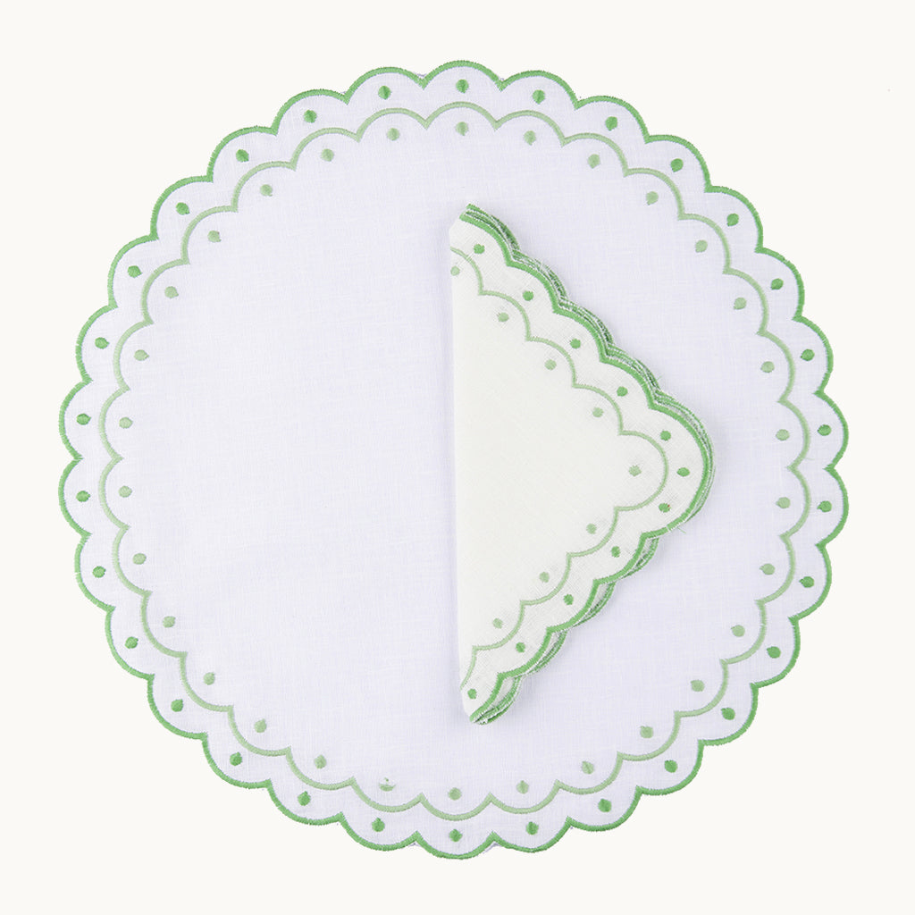 The Carmen green napkins are crafted from 100% linen and feature elegant embroidery with scalloped edges that add refined decorative charm to beautifully styled tables. Their soft green detailing brings freshness and timeless sophistication to any setting.